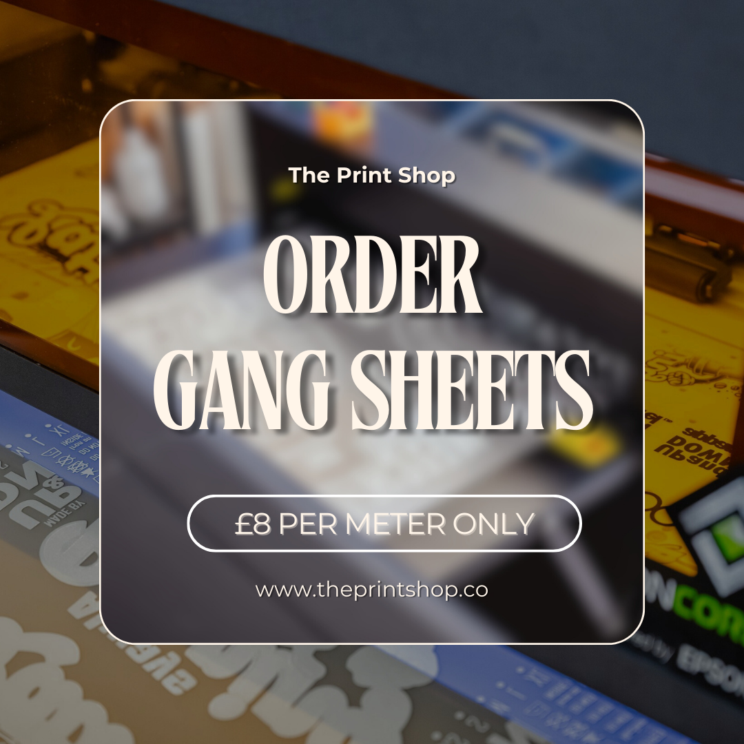 We offer gang sheets from 50 to 100 meters at only £8 per meter. You can place all your designs together on one long sheet. This saves time, reduces waste, and cuts down your printing cost per design.